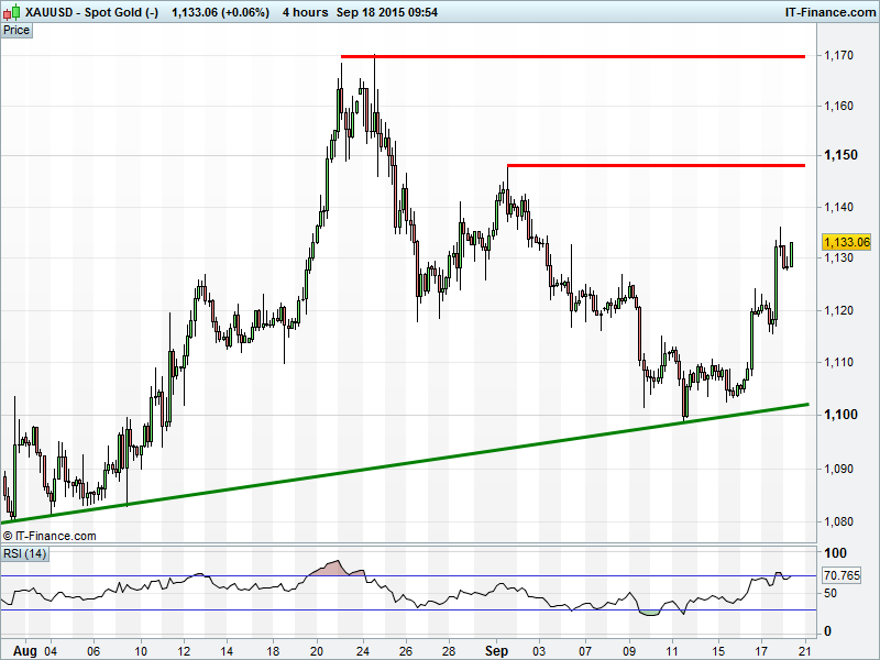 UK Index toying with breakdown from bearish head & shoulders top formation at 6150. DAX broken below Aug 25 rising support but holding above 10-day lows around 10100. Dow still in uptrend from End August, although back below yesterday’s 16700 breakout level. Gold has built on its $1100 breakout at to test $1135 helped by fed uncertainty and weaker USD.