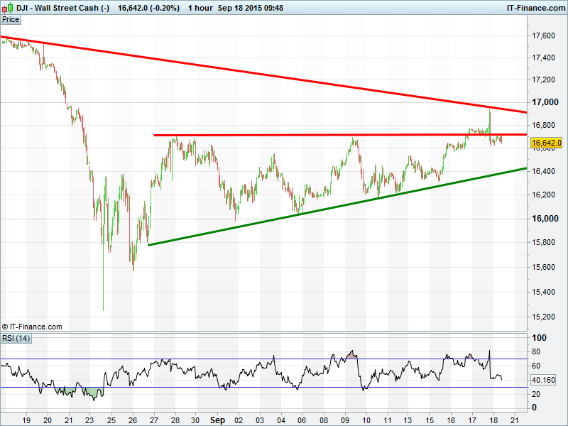US Dow Jones futures back below yesterday’s 16700 breakout level having been sent backwards by falling highs resistance dating back to late July. The level has since proved resistance. Uptrend from end-August still in play, but minor correction required?