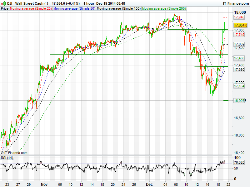 US Dow Jones touched 17900 briefly after registering its biggest one day gain in 3 years. All time highs are well within touching distance now with 18000 a very realistic target. Support should come around 17810 and 17749. The 50 day moving average has crossed above the 100 day moving average whilst the RSI is still overbought.