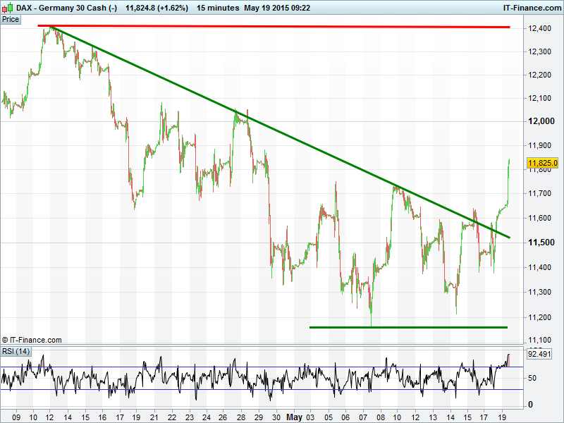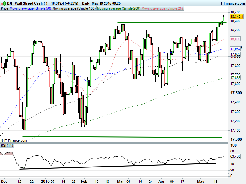 The US Dow Jones continues with its breakout to new all-time highs after a period of consolidation yesterday. Daily RSI still not overbought. Recent gains rather steep.