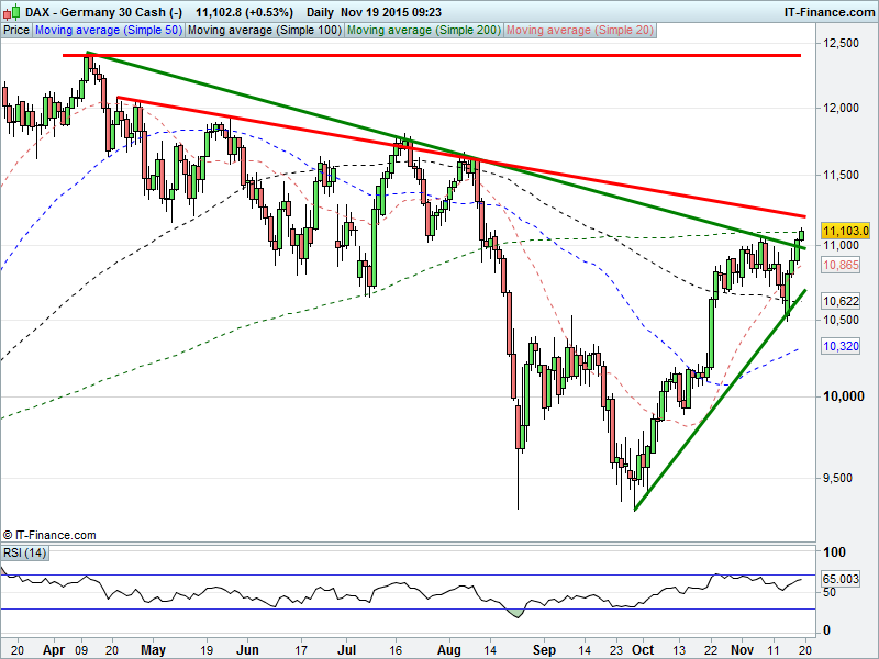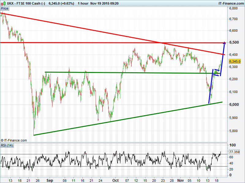UK Index broken above 6300, potentially on track for 6500. Dax broken above April falling highs at 11000. Wall St above 17700 to test 17800. Gold off its lows and broken back above $1074.
