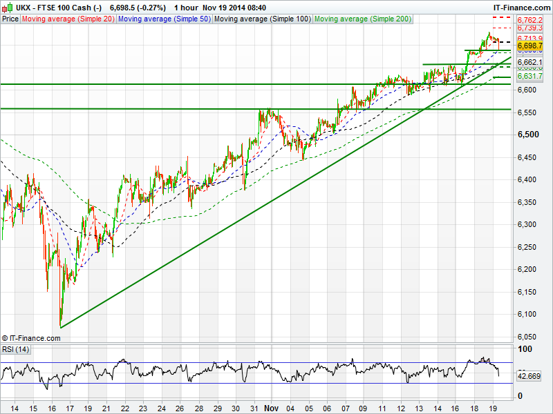 The UK’s UK 100  is trading around 6700 this morning which was a key level we highlighted yesterday. A brief break below this morning was not sustained after support was found at the 50 day moving average. 6700 will again be a technically import level today with plenty of support to the downside whilst resistance may come in around yesterdays high of 6730. The RSI, however, has begun to pick up pace in its decline.