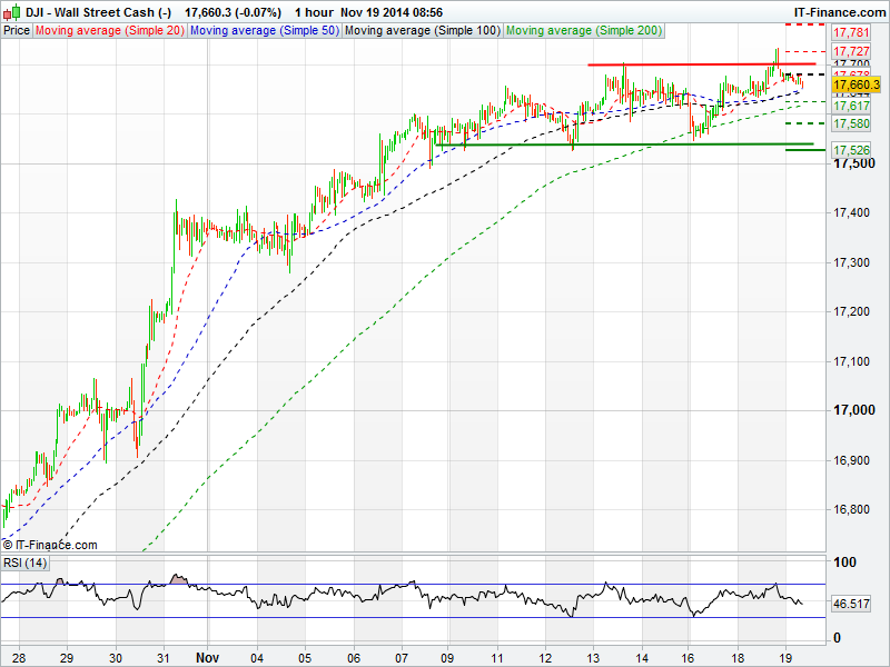 US Dow Jones is still trading in its 1 week range, although it did break above the channel briefly towards the end of the trading session yesterday, registering a new all-time high. Overnight we saw the 50 day moving average cross above the 100 day moving average with potential support coming around the 50 day moving average whilst resistance could again be felt at 17700.