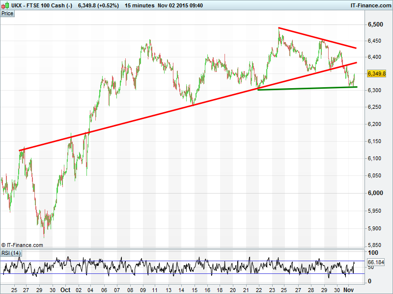 UK 100 broken below October rising lows, but found support at 6310. Continued pause before resumption of uptrend?