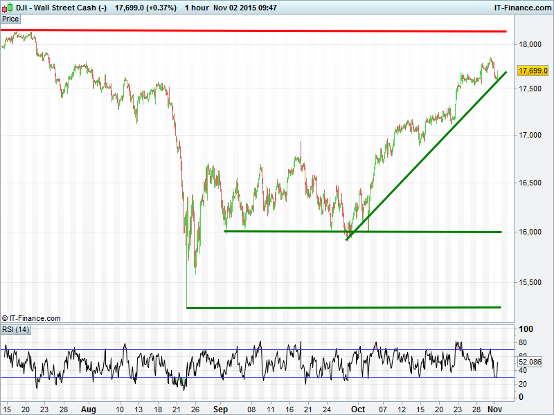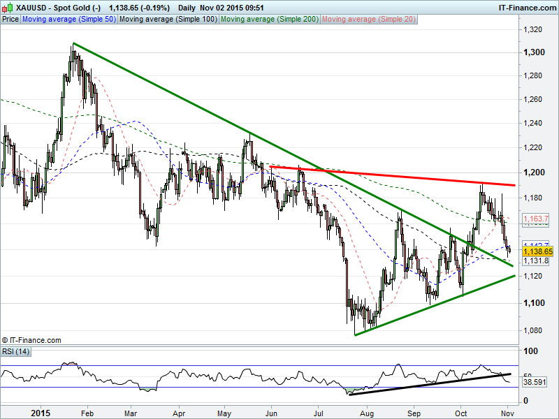 UK Index broken down from October rising lows, but bounced at 6310. DAX testing a bullish flag pattern breakout at 10900. Wall St October uptrend seen another bounce at 17600. Gold remains weak, potentially headed for $1120.
