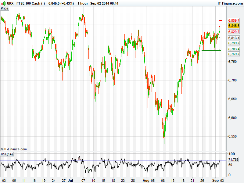 UK’s UK 100  is trading back at 2 month highs this morning after a relatively flat day yesterday. Resistance around 6835 was broken in early trading signalling a possible push back up towards early July highs of 6876.