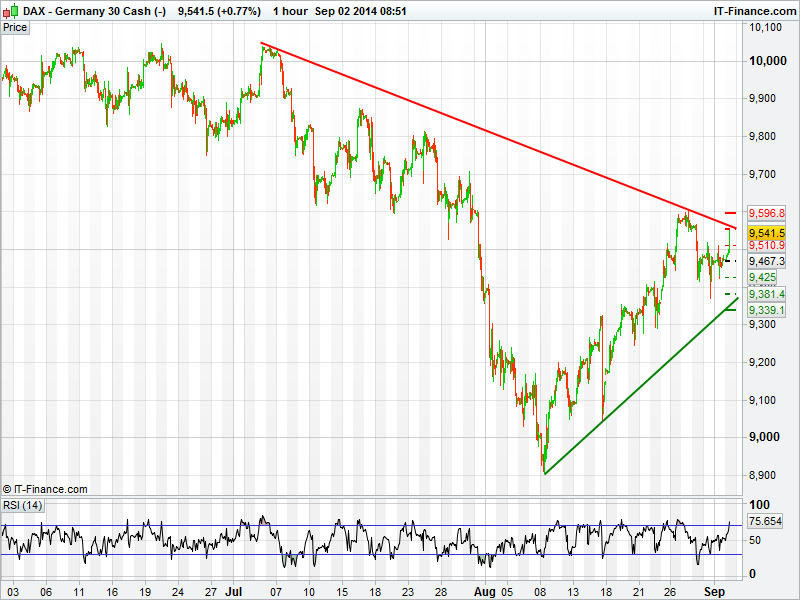 Germany’s DAX is trading higher this morning as it approaches a 2 month falling trend line that could act as a level of resistance. A break of this level could see a push towards 9600 before a move back up to 9700. Support to the downside could still found at the 4 week rising trend line.