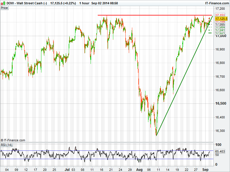 The US Dow Jones could be set for yet another all-time high today, after being closed yesterday for Labor Day, the futures are pointing to a strong open only 25 points away from those all-time highs that we saw last week. Resistance may be felt at last weeks highs, which if broken could signal a push into the unseen realms of 17200’s. Support on the down side may be held at the 1 month rising trend line.