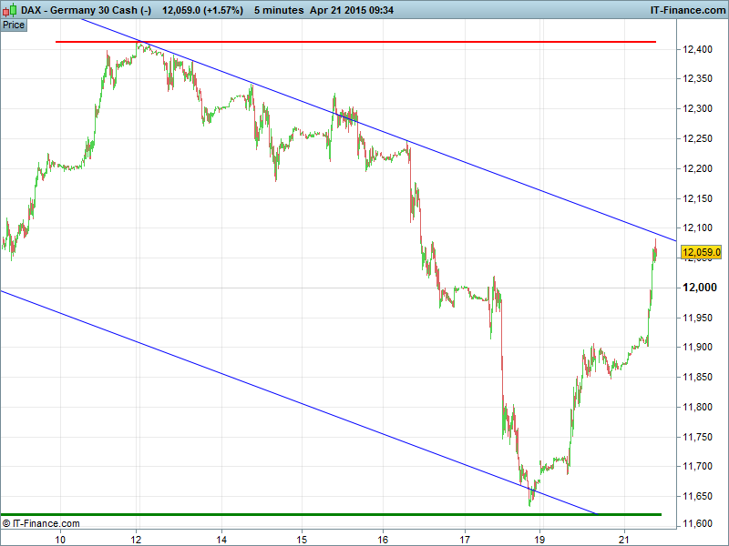 Germany’s DAX is testing the upper bound of a falling channel within a wider sideways trend.