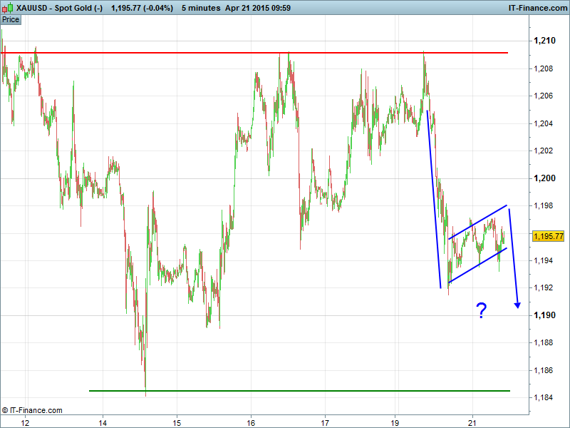 Gold is stable but below $1200 this time round as demand falls sharply for safe haven assets. The yellow metal now in the midst of a bearish flag pattern that could signal further downside although support at April rising lows is still in play.
