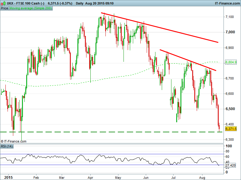 UK 100 testing support near YTD lows just north of early July lows; potential for 6370 support to coincide with the floor of a falling channel tracking March and early July lows while a break below this level likely to send the index negative for the year.