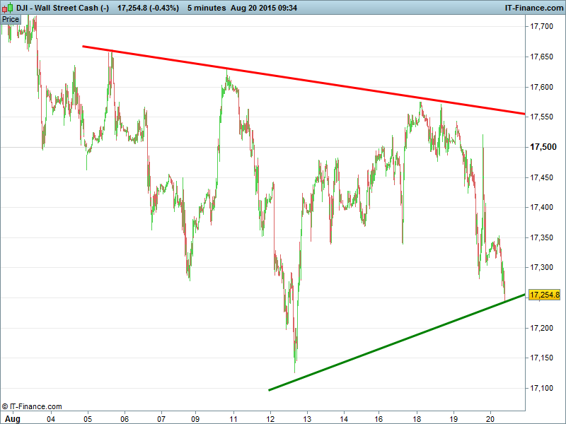 US Dow Jones futures heading into a 1-month narrowing pattern. Potential for a bounce towards 17350 with falling highs potentially attainable if the level is broken. A pullback below support likely to find respite at 17200.