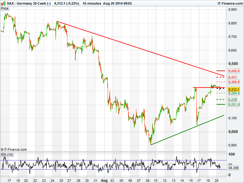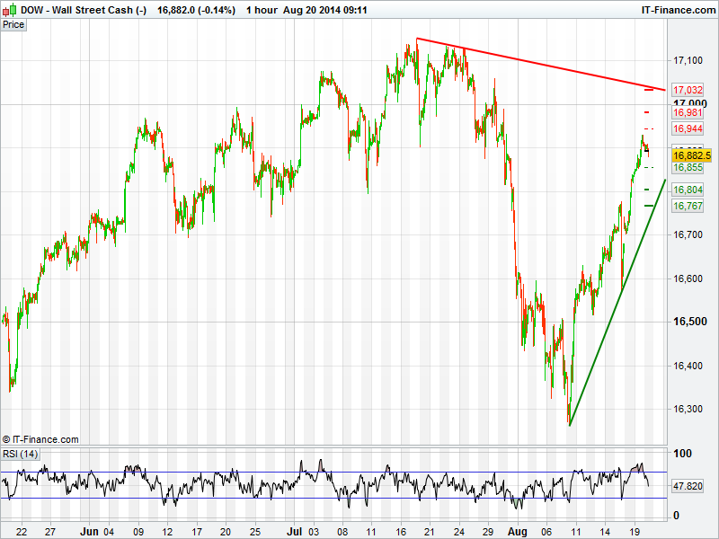 The US Dow Jones is still making headway into the losses incurred at the end of July with 17000 within touching distance. However, increasing tensions from Iraq overnight may put the breaks on the short term rise. Yesterday saw resistance at 16931 which may be a level to keep a close eye on today with a break above giving potential to a push back above 17000.