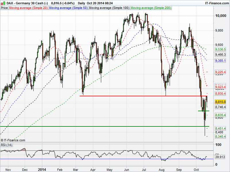 Germany’s DAX has found resistance once again at 8900, a level that could prove difficult to break. However, a break of this level could see the DAX head back towards 9200. Support may come around 8700 and 8500.