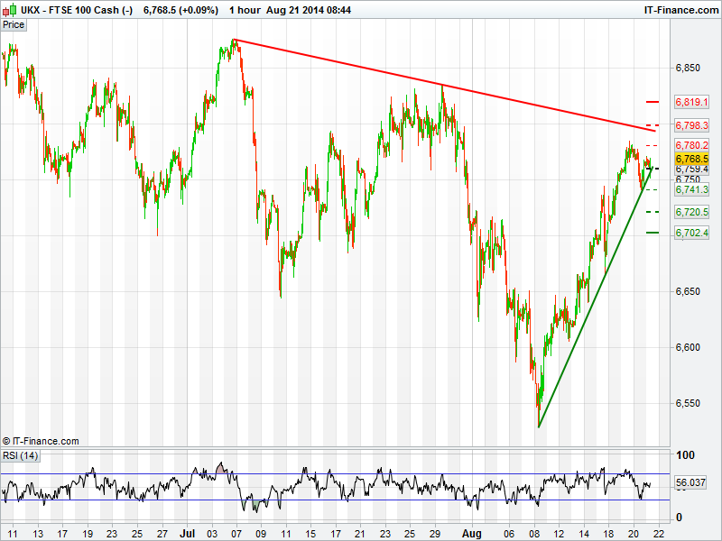 UK’s UK 100 found support yesterday at the 3 week uptrend line. However this was briefly broken this morning which could signal a move lower. The UK 100 is still trying to make moves higher and if support of the 3 week uptrend, around 6760, holds then we could see a move towards 6800.