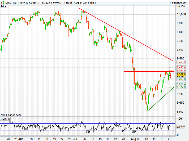 Germany’s DAX found resistance both yesterday and again this morning at 9353 which could now be a key level to watch. Better than expected Manufacturing and Service PMI data released from Germany this morning has helped turn the DAX positive, with a break of 9353 giving a potential move up towards 9500.