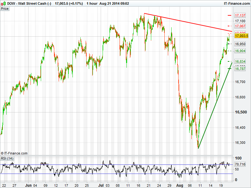 The US Dow Jones has broken the 17000 level this morning as the US markets continue to recover. Hawkish concerns from the FED’s minutes did little to curb the 3 week uptrend as the DOW futures look to a positive open. With a break above 17000 already seen this morning the DOW will now look to push towards those all-time highs again. Resistance may be felt at 17020 and 17067 but a raft of macro data this afternoon from the US could help (or hinder) the rise.