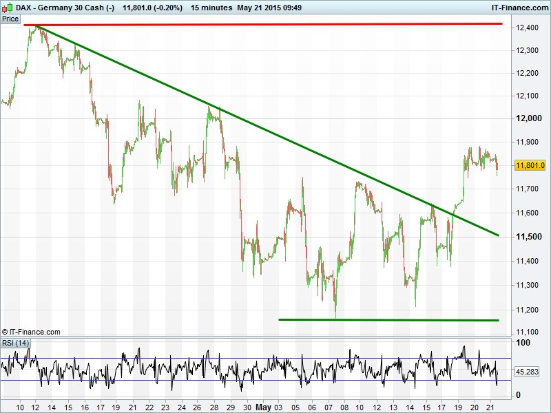 Germany’s DAX is taking a breather after its breakout from the April downtrend. Pause before another leg higher? Or drop back to 11600 support?