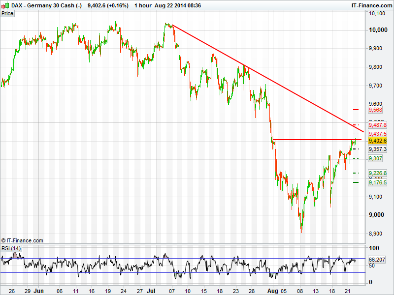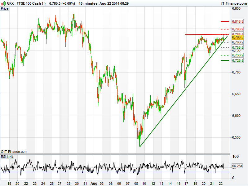 The markets are mixed this morning after another day of global gains yesterday saw them back up to late July levels. A very quiet day for macro data today could cause some traders to take some risk off the table ahead of the weekend. Tensions in Ukraine seem to be easing slightly with the Russia aid convoy given passage into Ukraine, however, tensions in other parts of the world could still play their part in stalling the market rise. FED chair Janet Yellen is speaking this afternoon in Jackson Hole, with traders eager to see what her comments on the FED’s next move will be.
