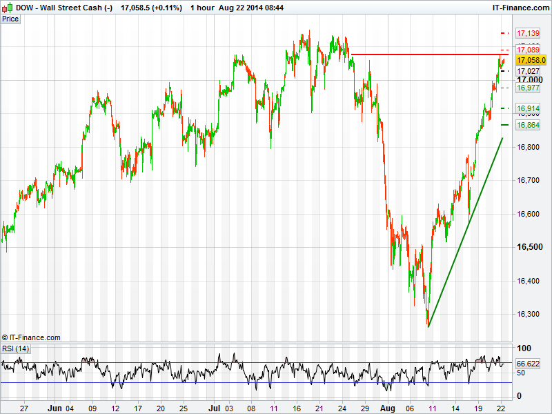 The US Dow Jones after breaking 17000 and then pushing through resistance at 17020 looks set to have a go at its all-time highs seen in July. However, with no macro data for release from the US today traders may look to book some profits and/or take some risk off the table ahead of the weekend. Resistance could be an issue at 17077, but a break of this level could set the DOW on course for a new all-time high.