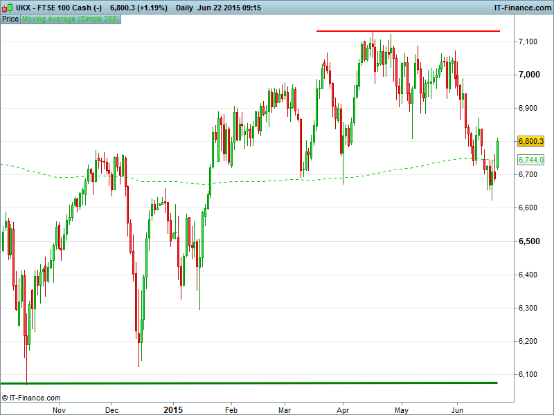 UK 100 has encountered resistance at 6800 after rallying strongly to break above prior resistance at the 200-day moving average 6744. Potential bottom at 6650 and near 100pt recovery from there makes a break out from the May/June downtrend possible, but entirely dependent upon the outcome of today’s emergency summit on Greece.