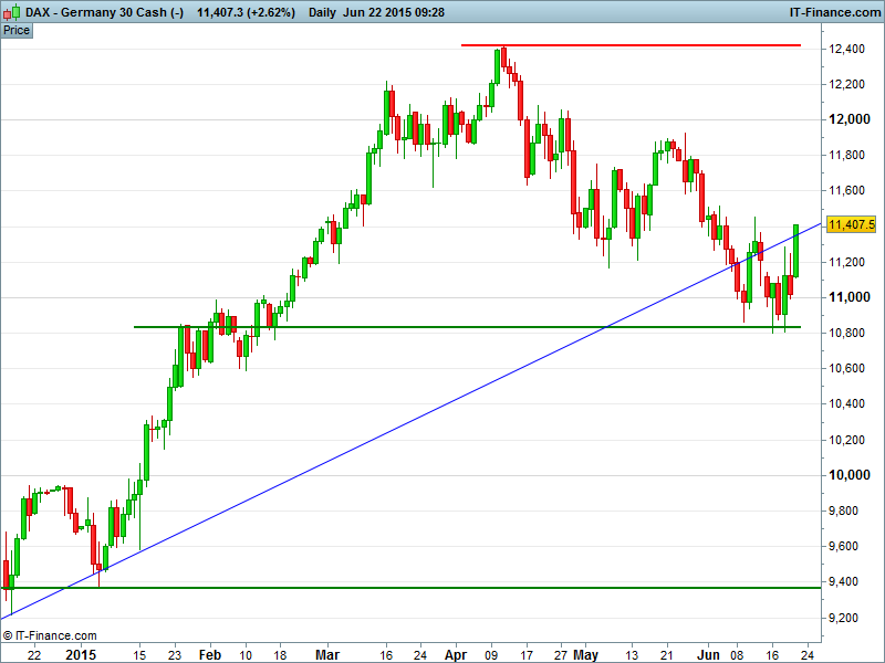 Germany’s DAX still giving hope that a bullish double-bottom reversal is in play the index continuing to rally upwards of 11,350 to test 3-June highs 11,516. Potential for a breakout of a 2.5 month falling channel and rising 8-month trend line provided we get a favourable outcome in Greek debt negotiations.