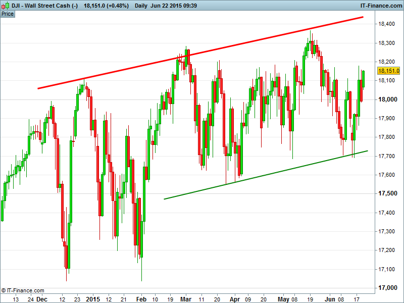 Like the DAX, the US Dow Jones looks to be continuing in a bullish-double bottom reversal with support kicking in twice at 17700 in June. The index remains in an upwards trending channel with a break above 18,200 putting prior all-time highs within reach.