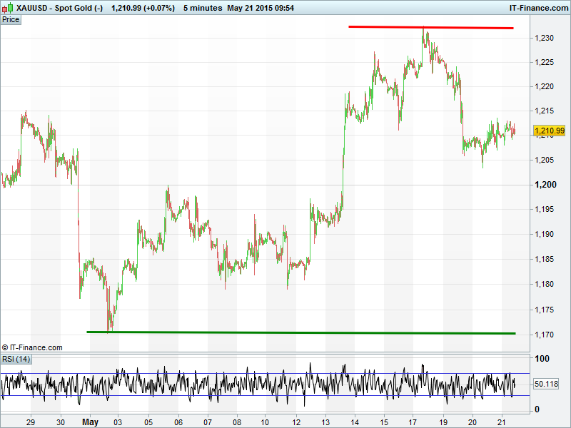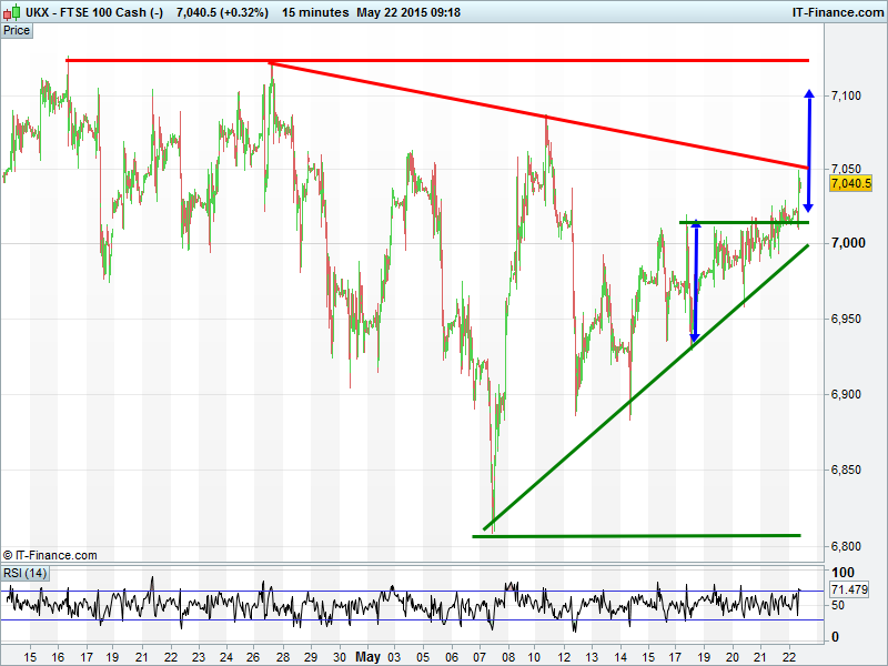 Equity markets mixed this morning with the UK Index making a breakout above it’s 1-week ceiling helped by Vodafone M&A optimism. DAX and Wall Street sideways into the long weekend with sentiment buoyed by weak US data helping keep a lid on US rate hike expectations, and thus the USD, and China indicators maintaining hopes of further stimulus. Both issues commodities-positive. Gold rebounded as investors take advantage of recent sell-off to position themselves for long-Greekend risk.