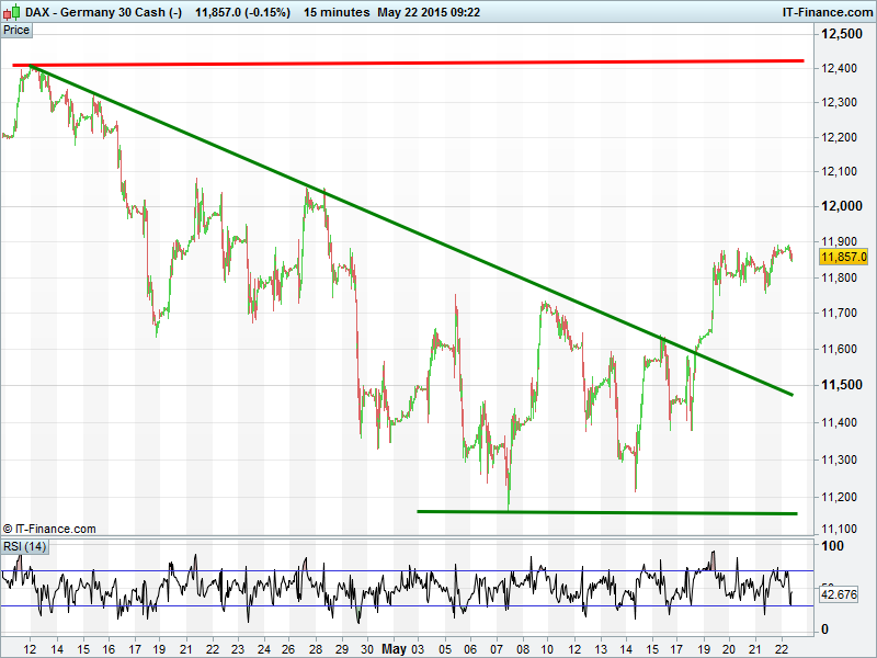 Germany’s DAX maintains sideways shift/breather following breakout at 11600, supported by 50-day MA. Another 400pt rally possible? Or fall back to rising lows at 11500.