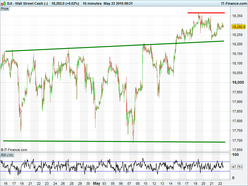 US Dow Jones holding steady after last week’s 18200 breakout and having registered new all-time highs. US data supportive of rate-hike delay, but further progress lacking clear catalyst. A pause. But which way next?