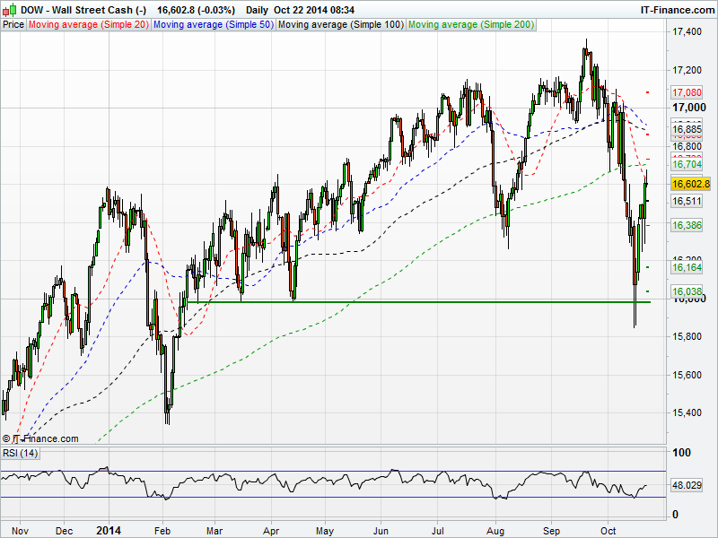 The US Dow Jones continued to eat into the losses suffered over the last month yesterday rallying over 200 points.We are now around 600 points off the lows of last week with resistance likely at the 200 day moving average around 16700, a break of which could signal a move towards 16900.