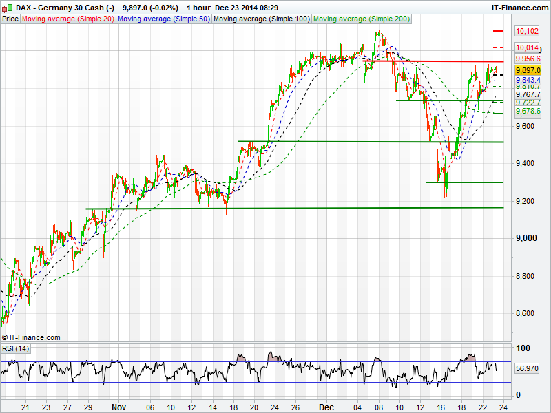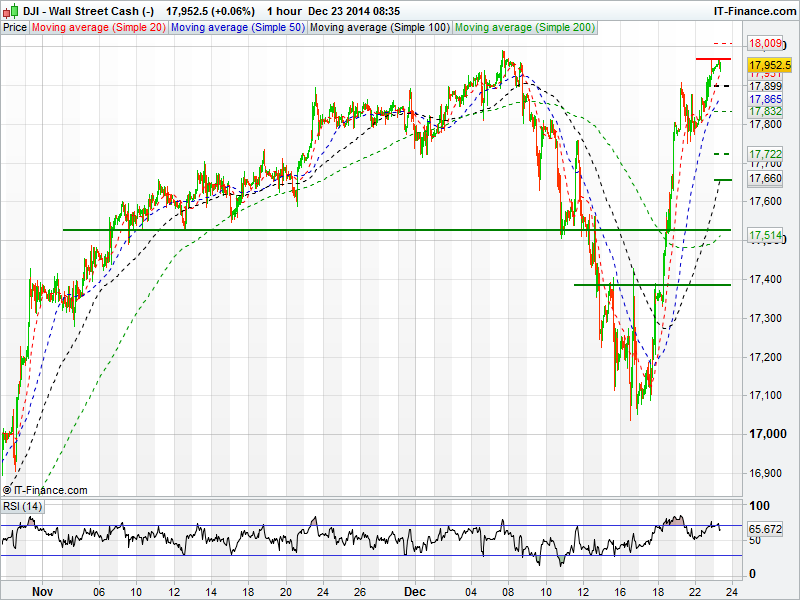 US Dow Jones closed at a record high yesterday as it rose for a forth straight session and registering its 35th record close for the year. 18000 is firmly within reach now with a break of resistance at 17970 being the main obstacle. Support could come around the 50 day moving average. The 100 day moving average has crossed above the 200 day moving average whilst the RSI is declining after falling from overbought.