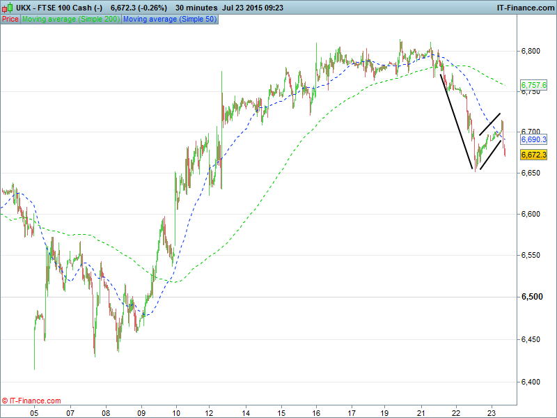 UK 100  heading south in what could be completion  of a bearish flag pattern with eventual support around 6,600. Note break below 50-day MA.