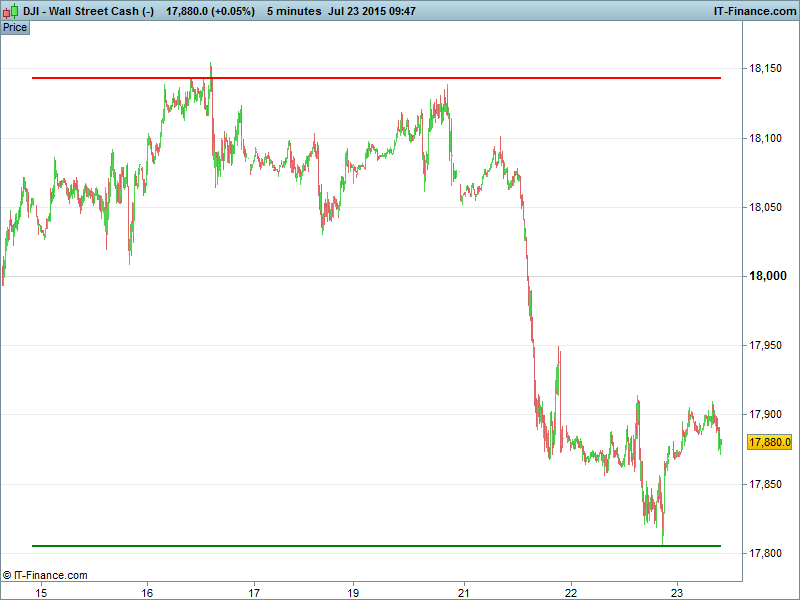 US Dow Jones trading near the floor of a 1-week sideways channel, resistance 17,910 proving a stiff hurdle for a recovery with resistance at falling highs since late on July 21st adding pressure.