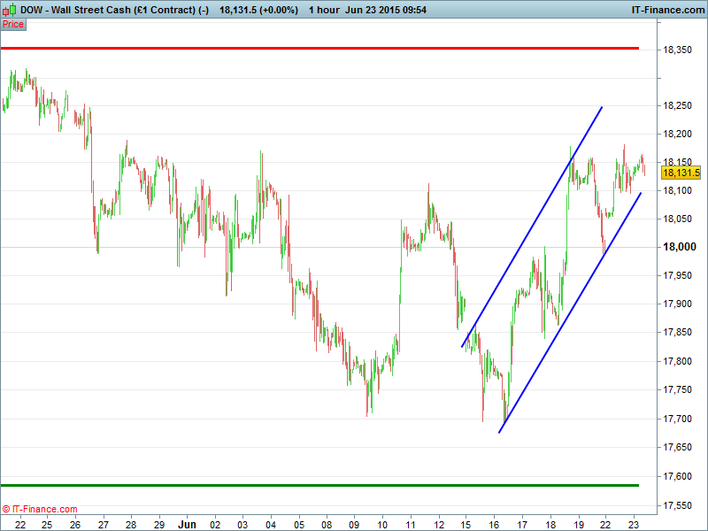 The US Dow Jones has encountered resistance around 18,160 with potential bearish double top threatening to sink the index back down to lows 17,700. 2-week uptrend still in play, however, with further upside possible from a favourable outcome to Greek bailout talks this week (if favourable it is).