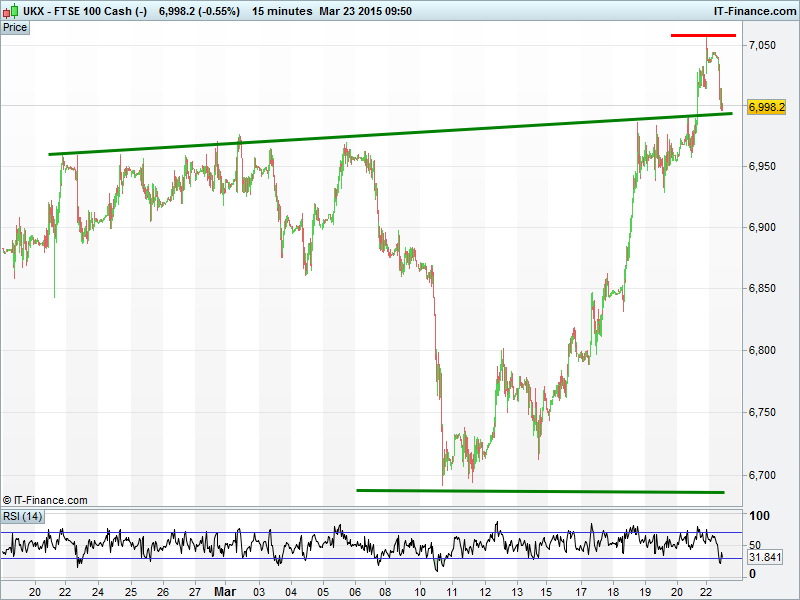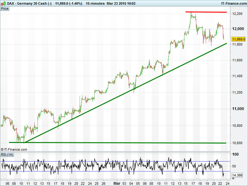 While Germany’s DAX trades back below 12000 the index maintains its 2015 uptrend with rising support from mid-February and the 20-day moving average around 11800. Will the trend remain your friend or should we beware falling highs from 16 March?