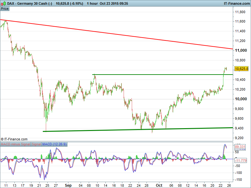 Germany’s DAX has broken above hitherto bugbear level 10,500. potential for consolidation before further gains while we note MACD peaked at long term high indicating the index may be overbought and due a larger correction.