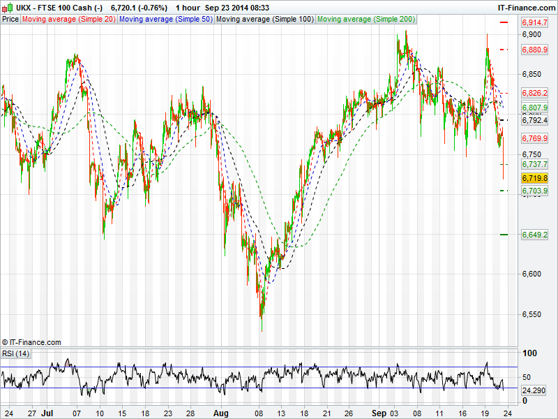 The UK’s UK 100  has taken a dive this morning as the Middle East conflict intensifies. Some of the UK 100 heavyweights are feeling the pressure this morning too which is weighing on the market. The RSI has moved into oversold territory and the the 50 day MA has broken below the 100 and 200 day MA’s. There looks little in the way of support until around 6650 with resistance likely around 6800.