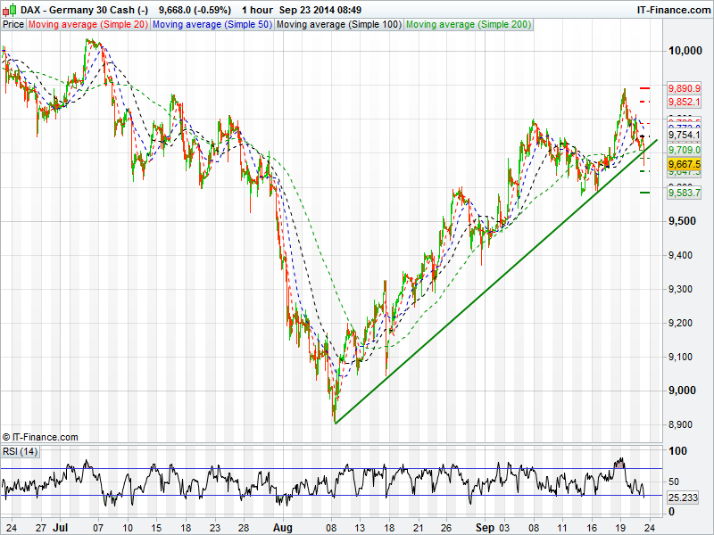 Germany’s DAX has broken below its 7 week rising trend line this morning after falling from Friday’s highs in which it failed to breach 9900. Support may come at 9647 with resistance now possible at the 200 day MA around 9709. The RSI has now broken into oversold territory.