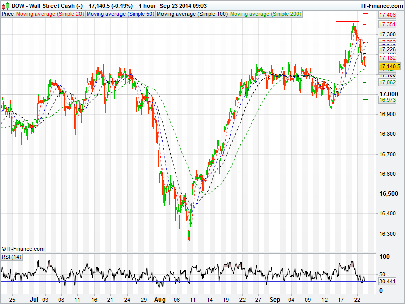 The US Dow Jones is continuing to decline from the all-time highs of last week as the US step up airstrikes against IS militants in Syria. The S&P 500 yesterday fell by its largest margin in nearly 7 weeks with the Dow following suit. Support may be found at the 200 day MA around 17127 and again at 17062. The 20 day MA has crossed below the 100 day MA, with the RSI trading on the boarder of oversold territory.