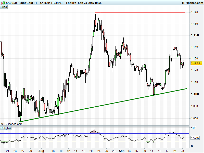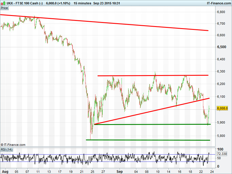 UK Index back above 6000 after plumbing Aug 25 lows below 5900 overnight. DAX revisited 9700 after bouncing from 9450. Wall St. eyeing 16400 after rebounding from 16200. Gold back above $1125 after bearish H&S top as the equity sell off and risk-off mentality sees safehaven interest renewed.