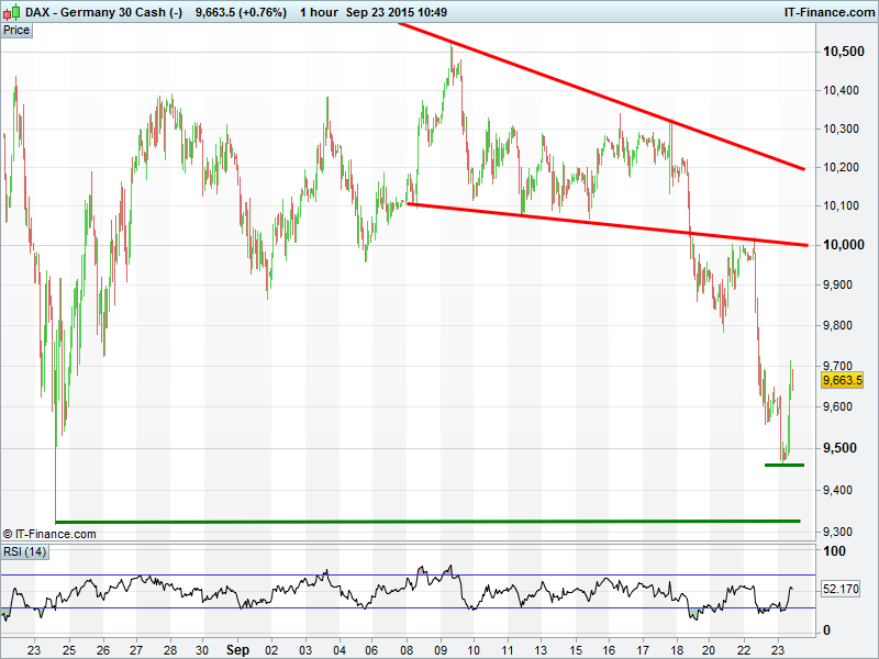 Germany’s DAX found support at 9450 to retest 9700 this morning. August downtrend seen another leg towards lows. 10000 now looks major resistance. Bearish flag pattern at 9600 looks off the agenda.