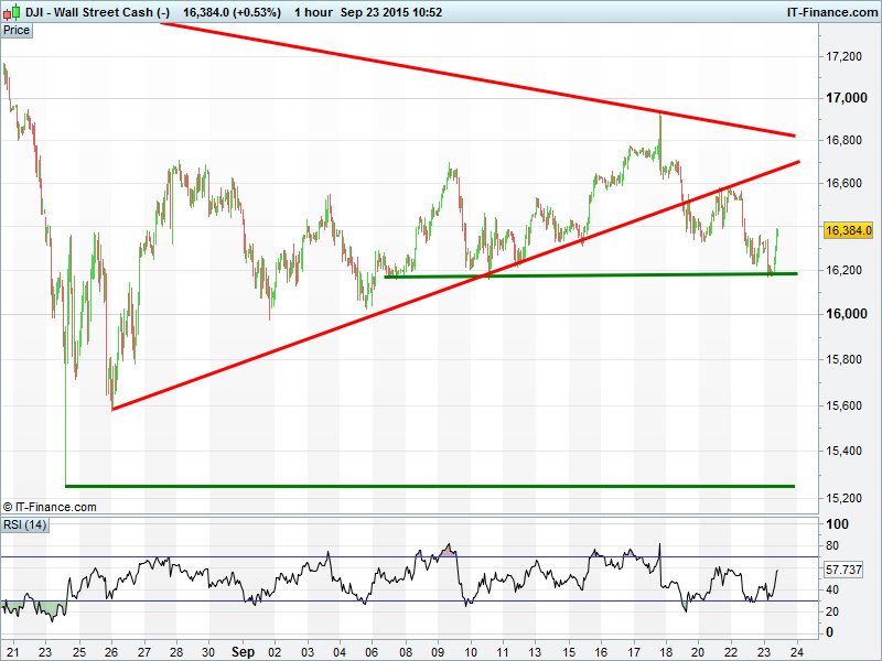 US Dow Jones futures bounced from 16200 which could allow for rally back to recent highs 16900. However, after abandoning the late-August uptrend it could also be the start of the right hand shoulder of a bearish head & shoulders top pattern (down to 15400?).
