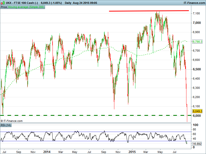 UK 100  has pared initial sub-6000 losses (hitting 2013 lows) to head back up around 6100. Note daily RSI well oversold, though not bottoming out just yet.  Last 2 times the RSI was significantly oversold, circa 500pt recoveries followed. Will we see another? or 3rd time unlucky?