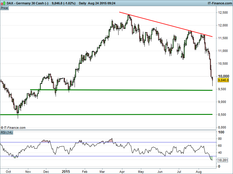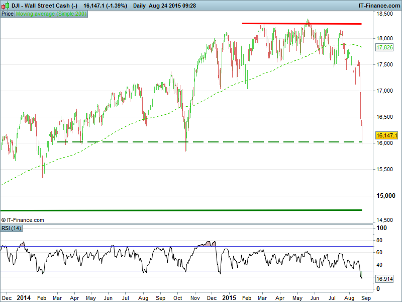 US Dow Jones futures found support at round number 16000, just north of Oct 2014 lows. Last time Wall St’s RSI was oversold a 1-week, 1000pt recovery followed.