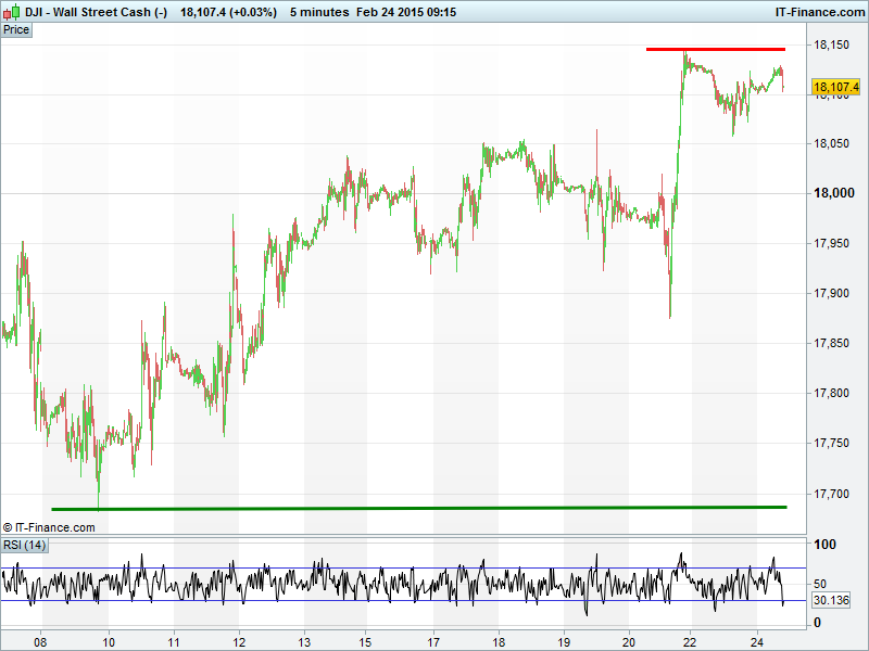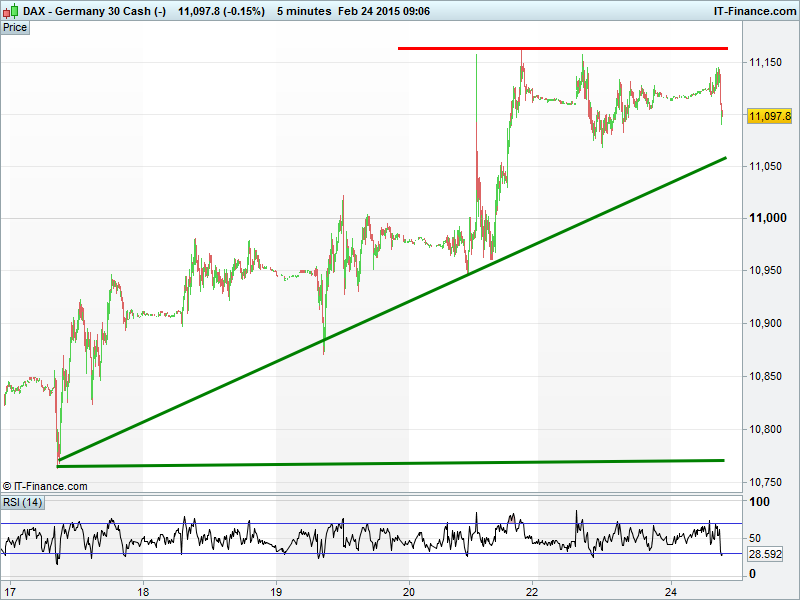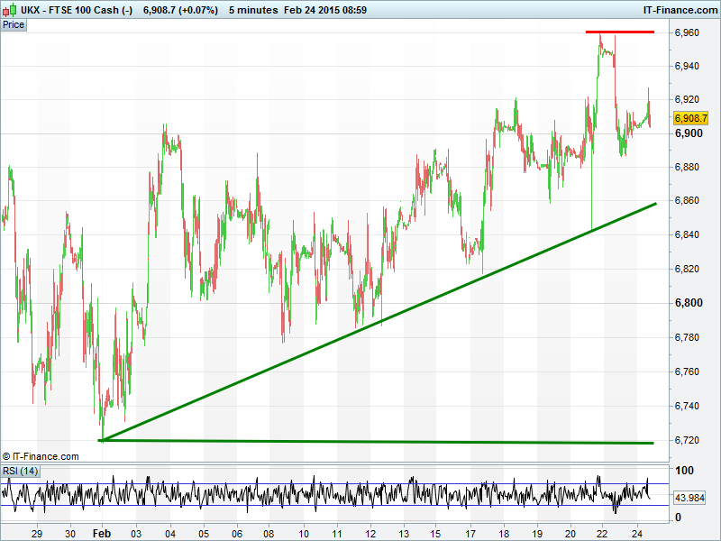The UK Index remains in its February uptrend although it sits almost equidistant from its recent highs and trend line of rising lows. Pretty much sideways since yesterday, its next move likely depends on the Brussels outcome.