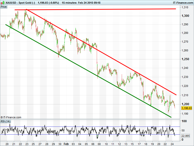 Gold refuses to budge from a solid 1-month falling channel, the ceiling of which could cap any near-term gains at $1200. It looks increasingly like rising support from early November has now been breached. However, we note trading activity in June and Dec 2013 around the $1180/90 region which may offer some near term support.