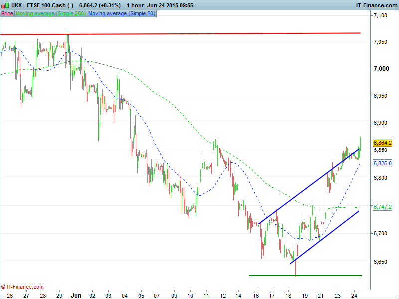 UK 100  is holding and building on this week’s gains so far (not wanting to hang around!) having breached the upper bound of a rising channel and just 5 pts away from key level 6870. Bulls looking for a breakout towards 6900 next while Bears remaining aware of profit taking and uncertainty over today’s 2 key Greece meetings making up the final shoulder of a bullish H&S reversal pattern.