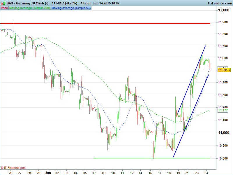 Germany’s DAX has pulled back a little from resistance 11,600 to test rising support at the 50-hour moving average 11,500 and the lower bound of its rising channel.