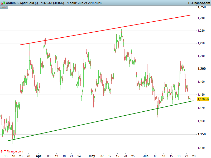 Gold still testing 3-month rising support $1175 but remains just inside a wide rising channel from March lows $1147 as a USD pullback fails to bolster demand for the yellow metal.